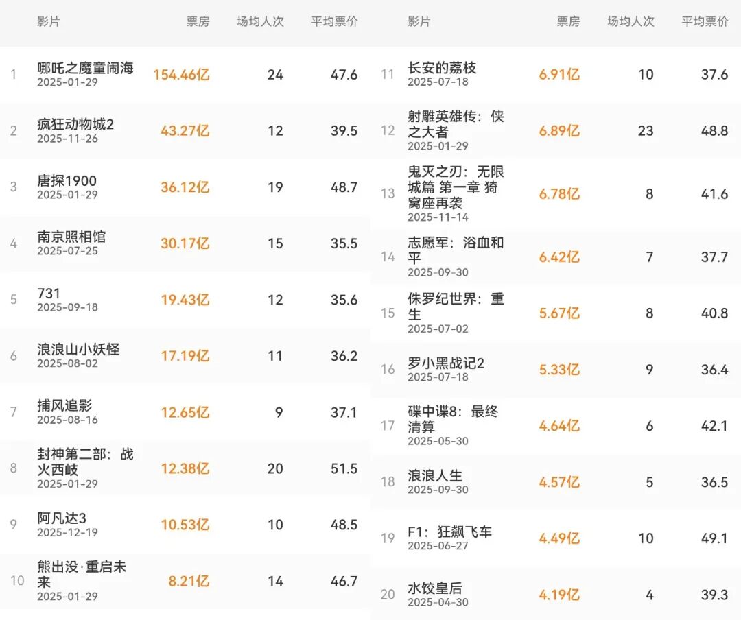 2025年票房排行(前20)圖源:燈塔專業(yè)版