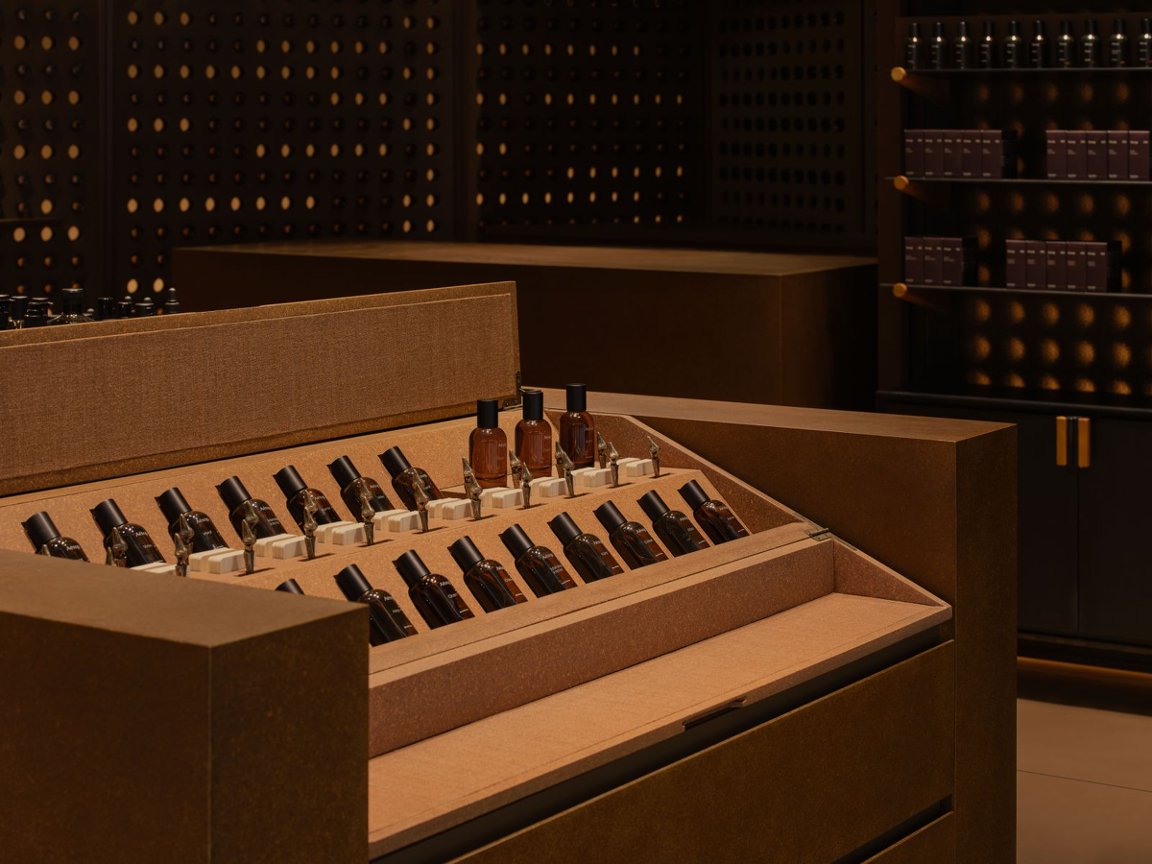 近日,Aesop伊索在上海前灘太古里開設(shè)新店,其設(shè)計(jì)從上海夜晚的城市光影中汲取靈感。店鋪利用回收自澳大利亞及亞洲門店的五千余個(gè)琥珀色玻璃瓶,通過鏤空飾板與圓孔鑲嵌的方式,在外立面、墻面及天花板形成光線折射效果。這一設(shè)計(jì)既減少了空瓶浪費(fèi),也呼應(yīng)了上海兼具現(xiàn)代感與詩意的城市氣質(zhì)。