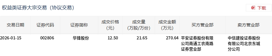1月15日,華鋒股份大宗交易成交21.65萬(wàn)股,成交額270.64萬(wàn)元,占當(dāng)日總成交額的1.68%,成交價(jià)12.5元,較市場(chǎng)收盤(pán)價(jià)12.76元折價(jià)2.04%。