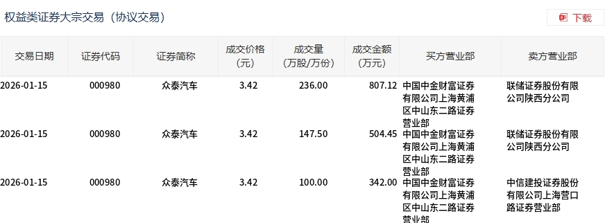 1月15日,眾泰汽車大宗交易成交483.5萬(wàn)股,成交額1653.57萬(wàn)元,占當(dāng)日總成交額的5.39%,成交價(jià)3.42元,較市場(chǎng)收盤(pán)價(jià)3.42元持平。