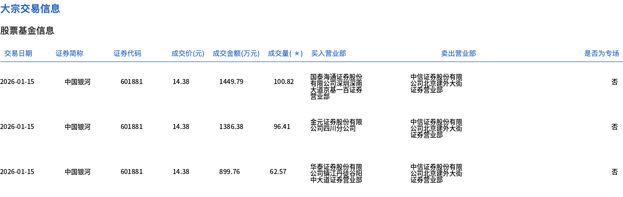 1月15日,中國(guó)銀河大宗交易成交259.8萬股,成交額3735.93萬元,占當(dāng)日總成交額的3.55%,成交價(jià)14.38元,較市場(chǎng)收盤價(jià)15.68元折價(jià)8.29%。
