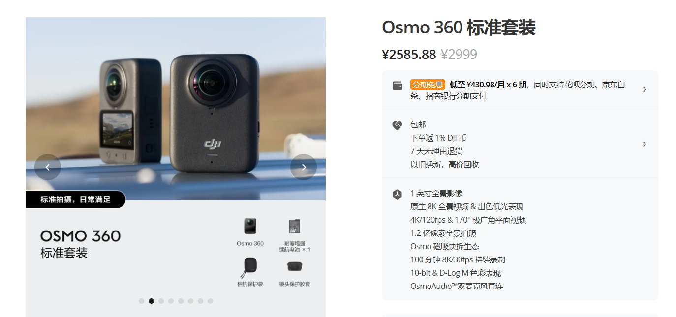 影石宣布做無人機(jī),當(dāng)天下午,大疆就官宣將發(fā)布全景相機(jī)。幾個(gè)月后,Osmo 360以2999元的定價(jià)切入市場(chǎng),參數(shù)對(duì)標(biāo)影石X5,價(jià)格直接低了800元。