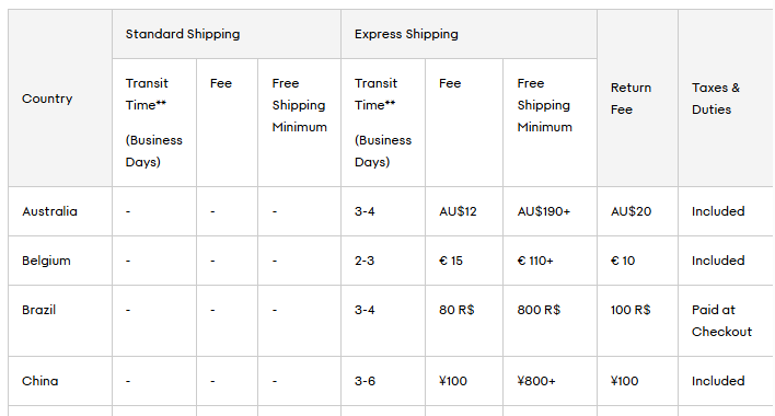 根據(jù)官網(wǎng),中國(guó)內(nèi)地消費(fèi)者在購(gòu)買(mǎi)超過(guò)800元商品后將可以免運(yùn)費(fèi),退換貨費(fèi)用在100元左右,大概3-6天就可以收貨。不同國(guó)家或地區(qū)的免運(yùn)費(fèi)門(mén)檻有所不同,例如中國(guó)香港需消費(fèi)滿(mǎn)900港元、法國(guó)需滿(mǎn)110歐元、德國(guó)需滿(mǎn)230歐元……