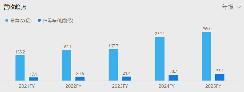 2025財(cái)年,其營收為約259億,凈利潤超過35億,業(yè)績不斷攀上新的高峰。