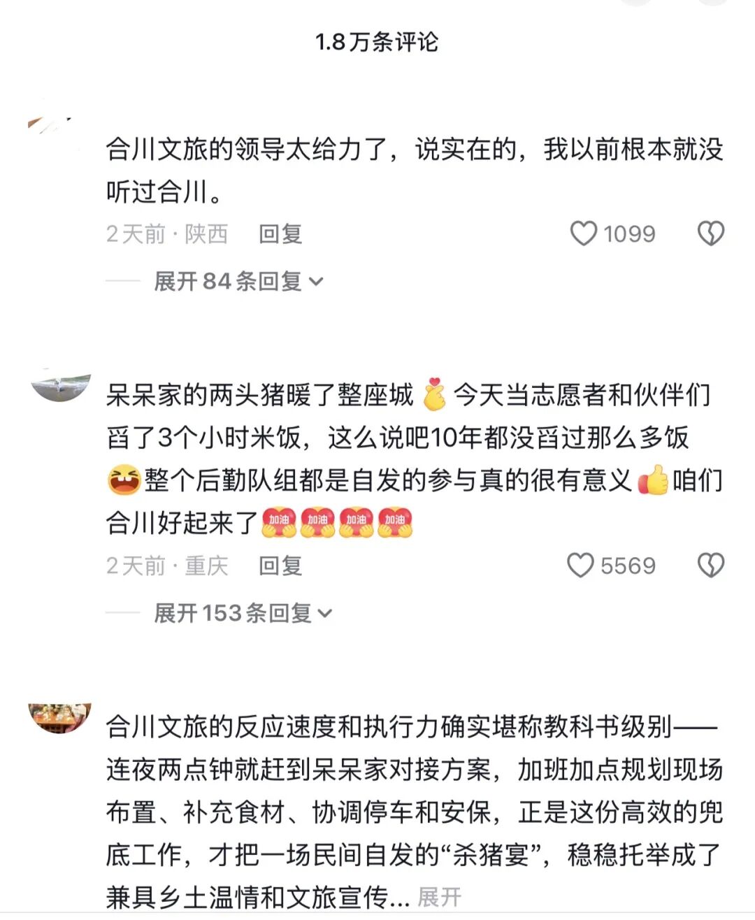 合川文旅就是一個典型的例子,呆呆的視頻剛火不到24小時,當?shù)匚穆貌块T就帶著釣魚城景區(qū)門票、合川桃片糕趕到現(xiàn)場,一邊幫著招呼游客、搭手干活,一邊連夜梳理出城區(qū)及鎮(zhèn)街的“刨豬湯打卡點”,附上地址和聯(lián)系電話,讓自發(fā)而來的游客有處可去、有景可逛。