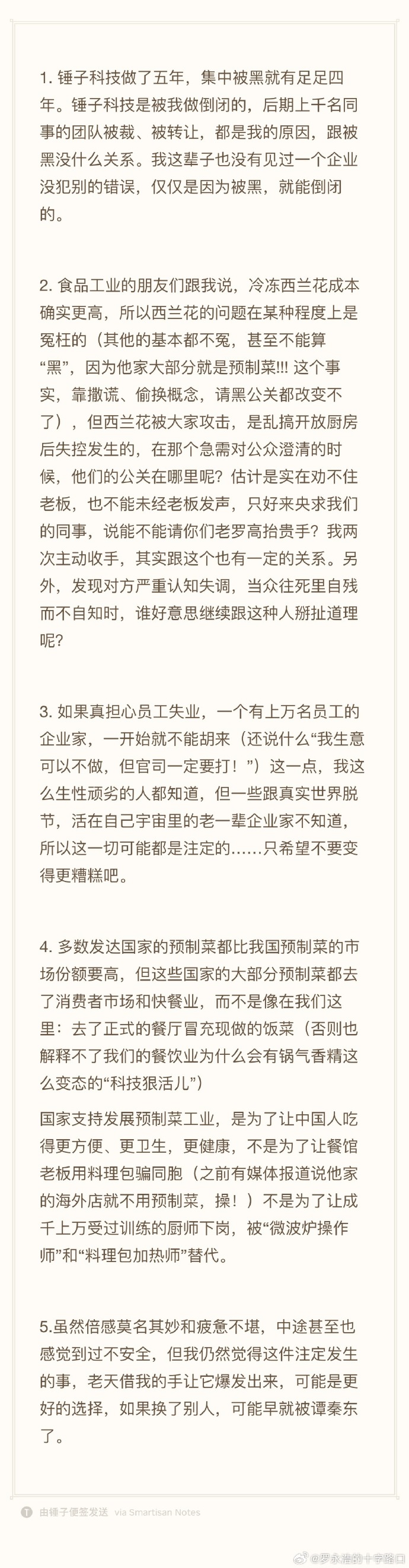 對此,羅永浩在文中回應(yīng),有食品工業(yè)領(lǐng)域的人士告訴他,冷凍西蘭花成本確實更高,所以西蘭花的問題在某種程度上是冤枉的。但他認(rèn)為,“其他的基本都不冤,甚至不能算‘黑’?!痹诹_永浩看來,“西蘭花被大家攻擊,是亂搞開放廚房后失控發(fā)生的”,此后則因公關(guān)能力不足導(dǎo)致批評聲被進(jìn)一步放大。
