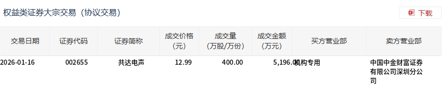 1月16日,共達(dá)電聲大宗交易成交400萬(wàn)股,成交額5196萬(wàn)元,占當(dāng)日總成交額的19.55%,成交價(jià)12.99元,較市場(chǎng)收盤(pán)價(jià)13.15元折價(jià)1.22%。