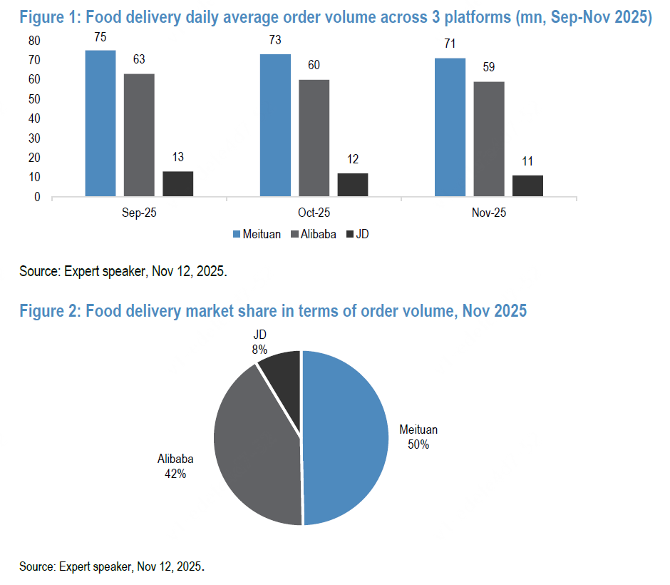 摩根大通的調(diào)研數(shù)據(jù)顯示,截至2025年11月25日,美團(tuán)外賣的市場份額下降到50%;阿里系(餓了么+淘寶閃購)占42%,與美團(tuán)的差距大幅縮??;京東外賣占8%。另外,根據(jù)晨星機(jī)構(gòu)的預(yù)測,2027年的即時零售市場,美團(tuán)、阿里和京東的份額將分別為55%、40%、6%。