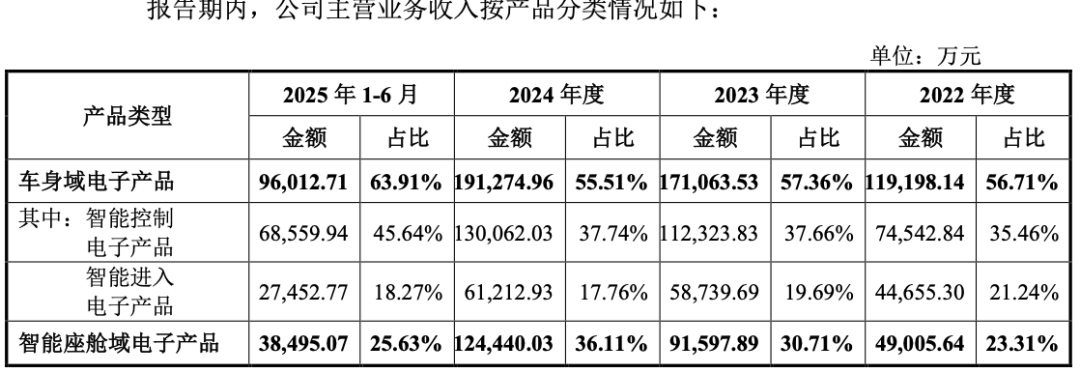 它主要制造四大類“大腦”:車身域電子產(chǎn)品是它的王牌和現(xiàn)金牛,像個 “車輛大總管”,管理車門、車燈、車窗等基礎功能。它占據(jù)了公司過半的營收,2022年-2024年、2025年1-6月(下稱“報告期”),該部分銷售金額分別為11.92億元、17.11億元、19.13億元和9.6億元,營收占比常年超過55%。