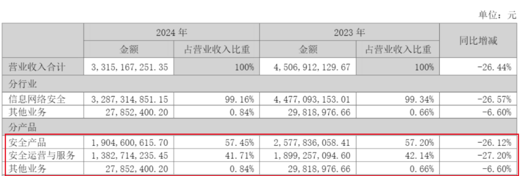 在這背后,公司的業(yè)務(wù)全線下滑。其中,安全產(chǎn)品實現(xiàn)營收19.05億元,同比下滑26.12%;安全運營與服務(wù)實現(xiàn)營收13.83億元,同比下滑27.20%;其他業(yè)務(wù)則同比下滑了6.60%。