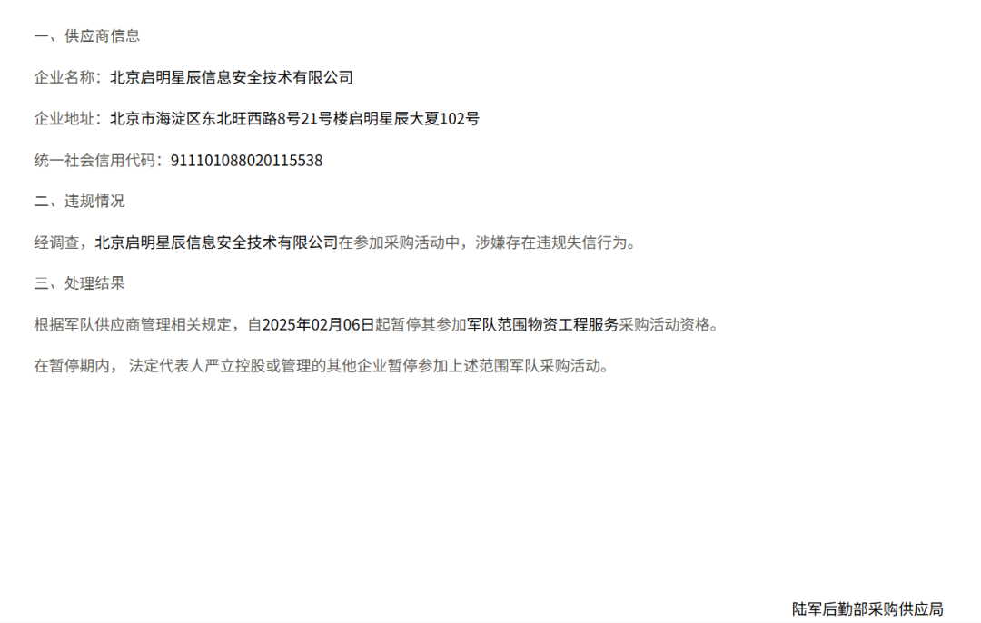 根據(jù)軍隊供應(yīng)商管理相關(guān)規(guī)定,自2025年2月6日起,暫停其參加軍隊范圍物資工程服務(wù)采購活動資格。在暫停期內(nèi),法定代表人嚴立控股或管理的其他企業(yè)暫停參加上述范圍軍隊采購活動。