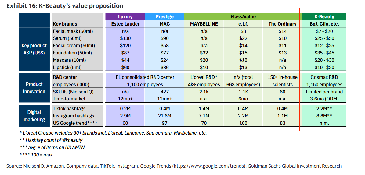 高盛在報(bào)告中指出,K-Beauty獨(dú)立品牌最具競(jìng)爭(zhēng)力的,并非單一成分或營(yíng)銷創(chuàng)意,而是其精準(zhǔn)卡位的價(jià)格帶。