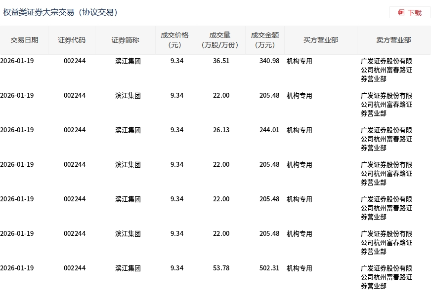 1月19日,濱江集團大宗交易成交204.42萬股,成交額1909.22萬元,占當日總成交額的2.7%,成交價9.34元,較市場收盤價10.47元折價10.79%。