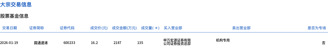 1月19日,圓通速遞大宗交易成交135萬股,成交額2187萬元,占當(dāng)日總成交額的8.06%,成交價(jià)16.2元,較市場收盤價(jià)17.12元折價(jià)5.37%。