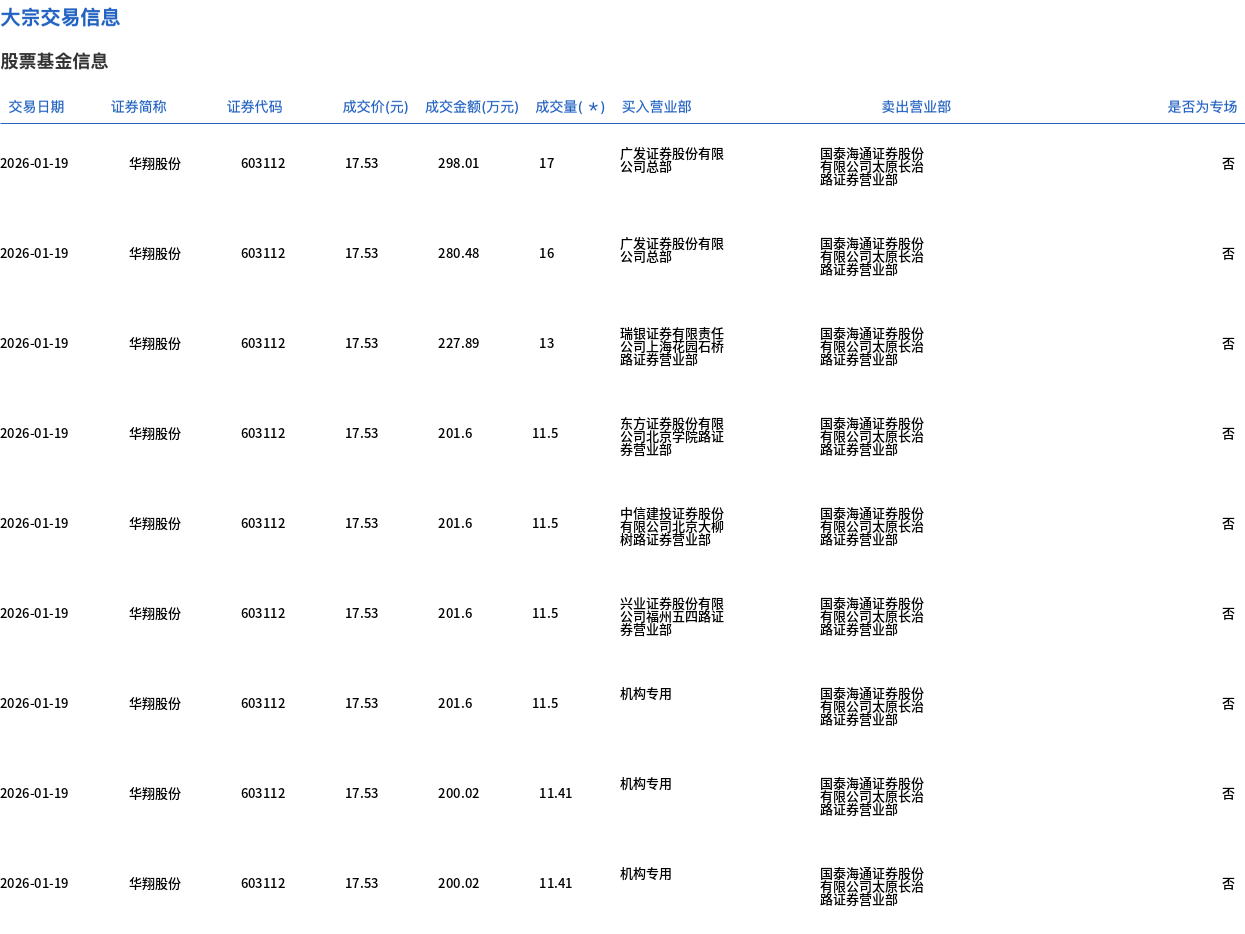 1月19日,華翔股份大宗交易成交114.82萬股,成交額2012.82萬元,占當(dāng)日總成交額的8.66%,成交價(jià)17.53元,較市場收盤價(jià)19.5元折價(jià)10.1%。