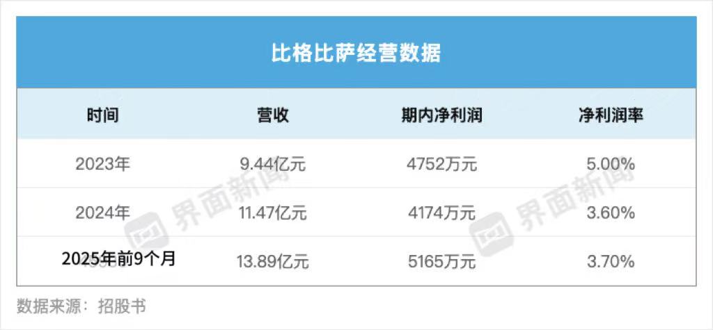 界面新聞在其招股書(shū)中看到,2023年、2024年及2025年前9個(gè)月,該公司分別實(shí)現(xiàn)營(yíng)收9.44億元、11.47億元、13.89億元。不過(guò)界面新聞自比格比薩品牌方獲悉,比格比薩在2025年整體業(yè)績(jī)?cè)鲩L(zhǎng)超過(guò)63%,同店增長(zhǎng)18%,一年?duì)I收超過(guò)20多億元。