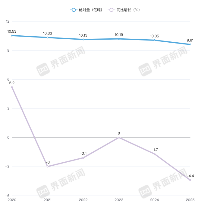 2020-2025年,中國(guó)年粗鋼產(chǎn)量累降9219萬(wàn)噸。
