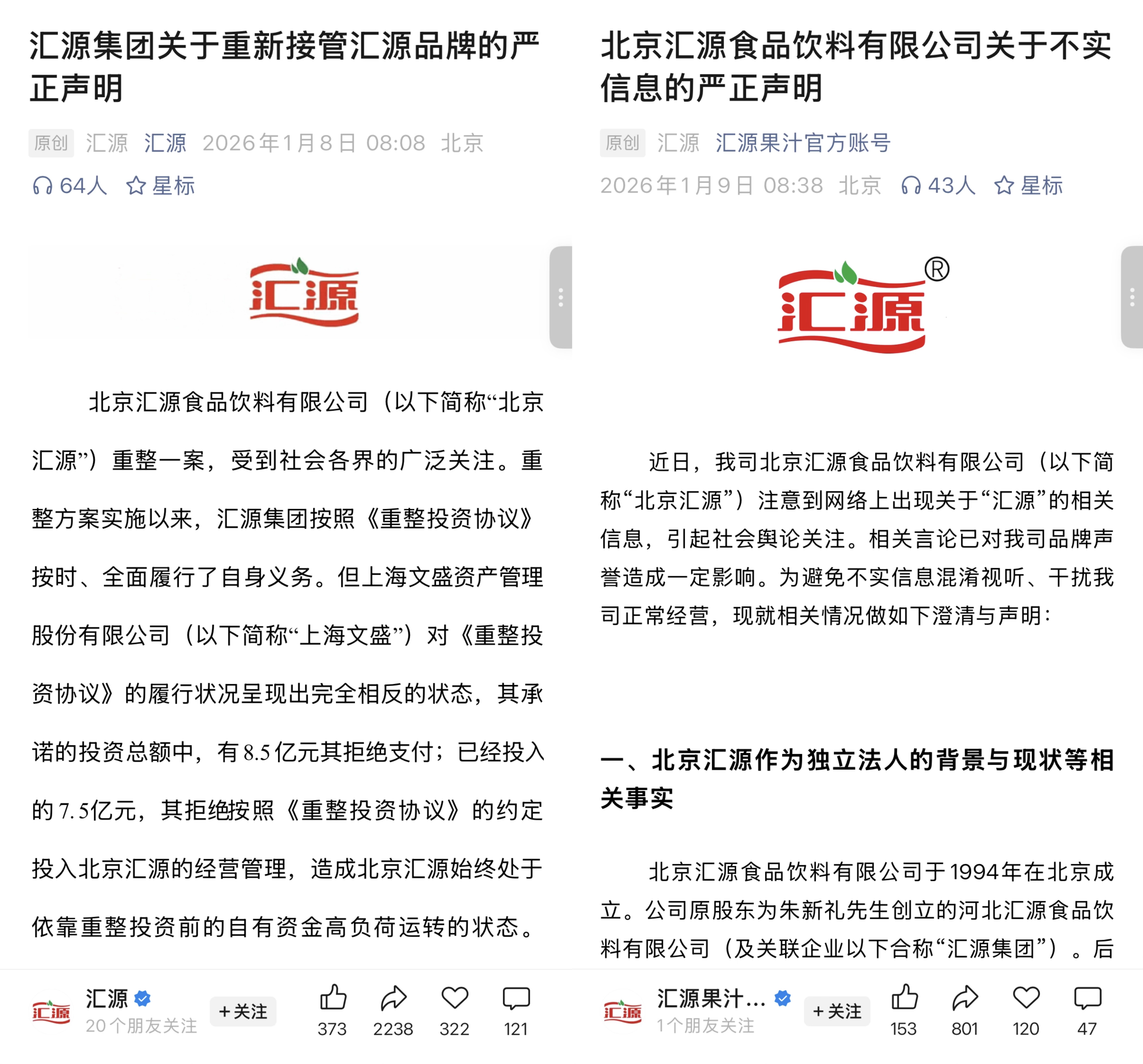 左右互搏的“兩家匯源” 圖源:各自公眾號(hào)