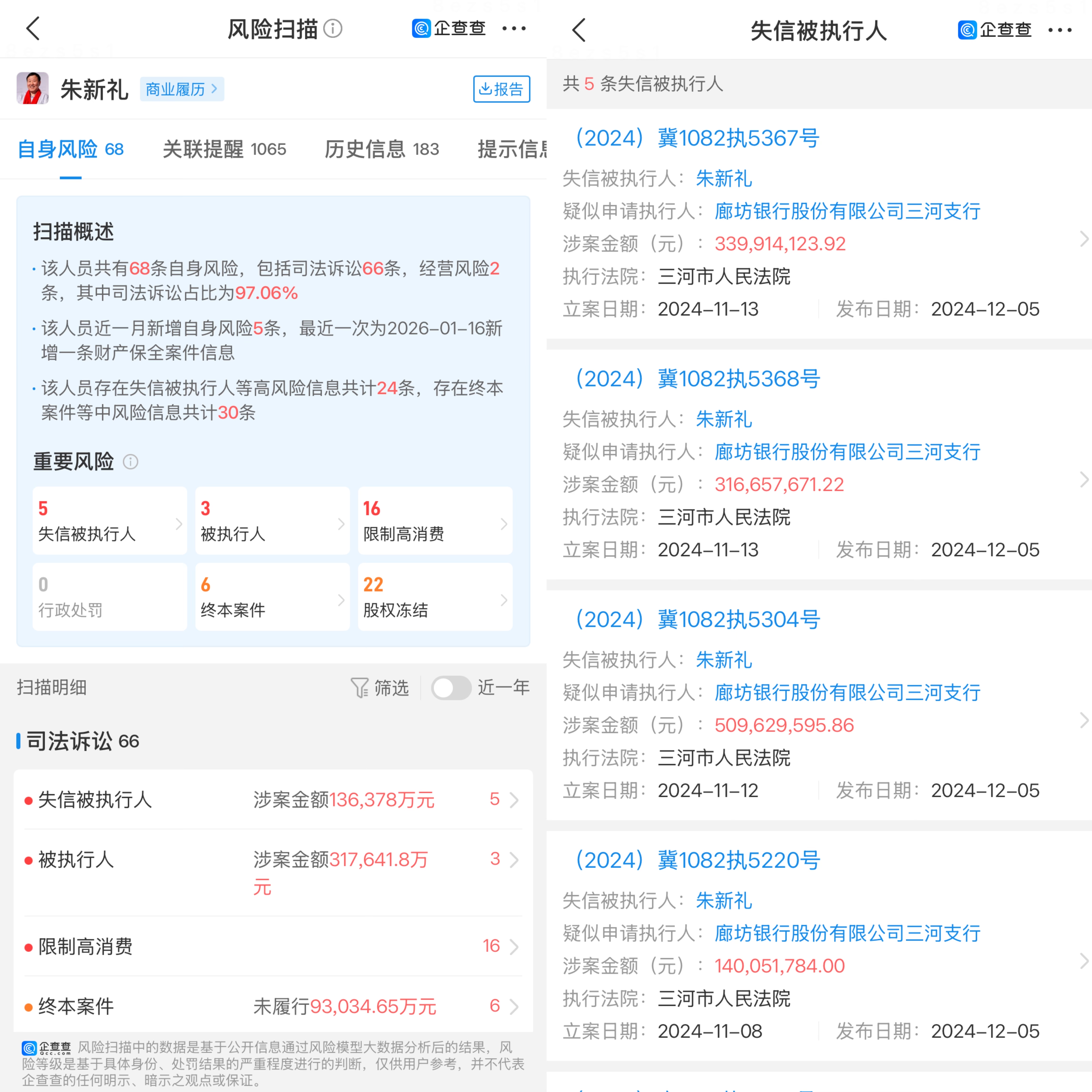 朱新禮的被執(zhí)行及限高記錄 圖源:企查查