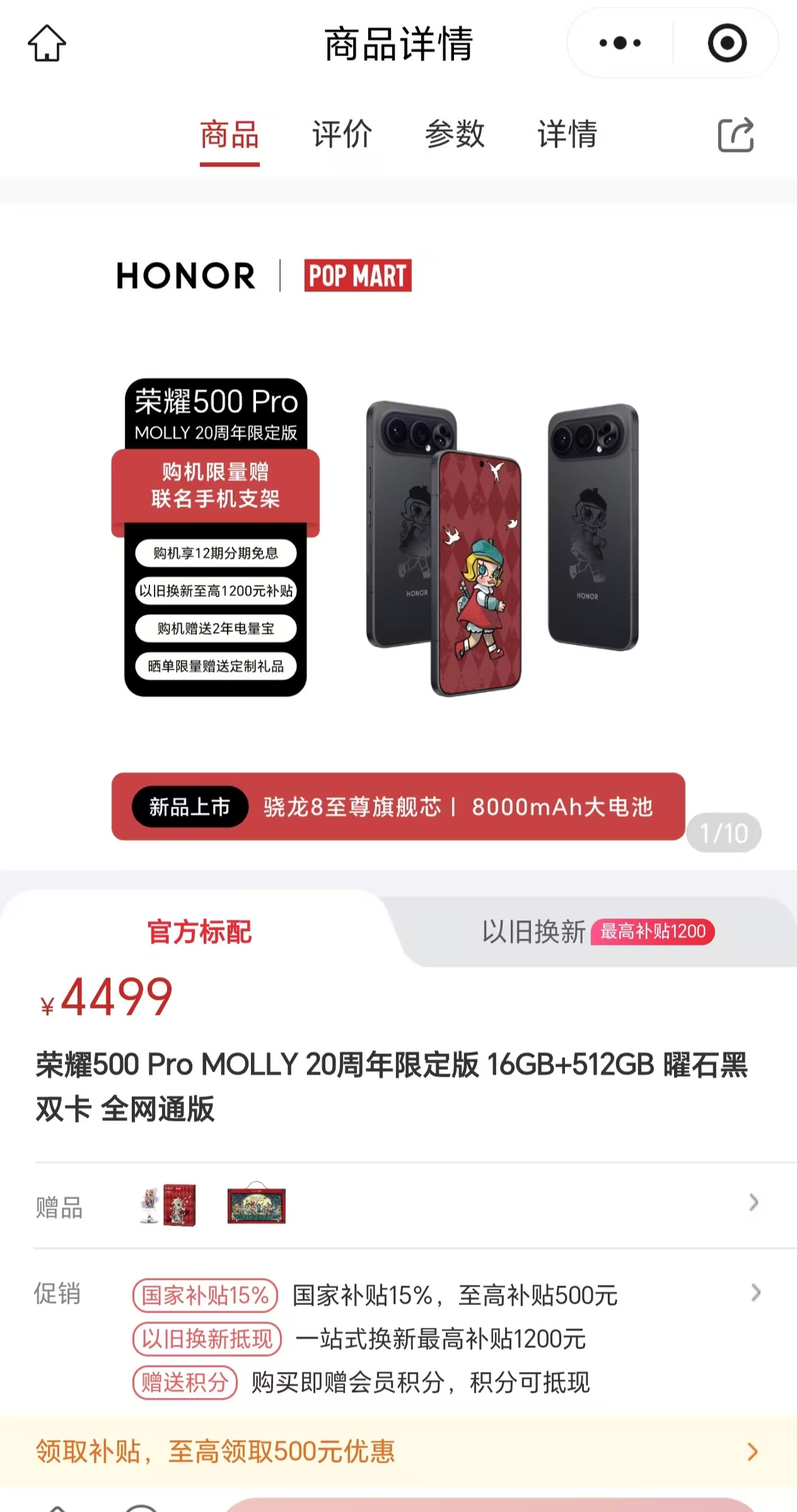 1月19日,榮耀與泡泡瑪特合作推出的“榮耀500 Pro MOLLY 20周年限定版”手機(jī)正式發(fā)布,售價4499元,國補(bǔ)后到手價3999元,將于1月25日上午10時08分正式開售。