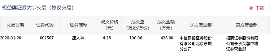1月20日,唐人神大宗交易成交100萬股,成交額428萬元,占當(dāng)日總成交額的4.46%,成交價(jià)4.28元,較市場(chǎng)收盤價(jià)4.37元折價(jià)2.06%。