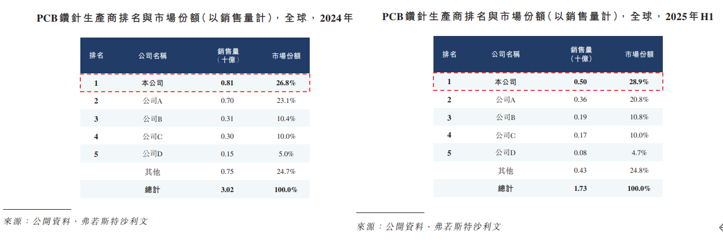 全球PCB鉆針行業(yè)的市場(chǎng)集中度較高。據(jù)弗若斯特沙利文數(shù)據(jù),按銷售量計(jì),鼎泰高科、中鎢高新旗下深圳金洲精工、日本佑能、臺(tái)灣尖點(diǎn)等全球前五大鉆針生產(chǎn)商合計(jì)市場(chǎng)占有率超75%;其中,2024年、2025年上半年,鼎泰高科分別以8.1億支、5億支排名全球第一,市場(chǎng)份額從26.8%增至28.9%。