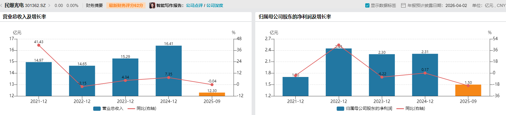 2023年、2024年,民爆光電營收分別是15.29億、16.41億元,分別同比增4.34%、7.35%;同期的歸母凈利潤分別是2.3億、2.31億元,分別同比變動(dòng)-6.22%、0.17%。進(jìn)入2025年,該公司業(yè)績開始下滑,營收、歸母凈利潤分別同比跌0.04%、19.75%至12.3億、1.5億元。