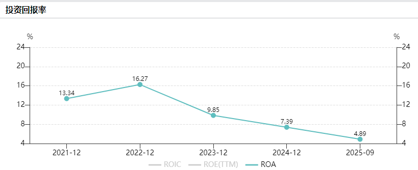 民爆光電上市后的投資回報(bào)率持續(xù)走低。Wind數(shù)據(jù)顯示,2023年、2024年及2025年前9月,該公司投資回報(bào)率從9.85%跌至7.39%、4.89%。