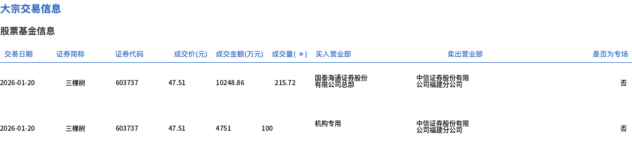 1月20日,三棵樹(shù)大宗交易成交315.72萬(wàn)股,成交額1.5億元,占當(dāng)日總成交額的18.23%,成交價(jià)47.51元,較市場(chǎng)收盤(pán)價(jià)48.38元折價(jià)1.8%。