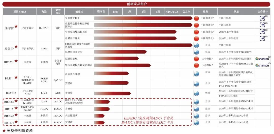 研發(fā)管線上,公司布局近10款產品,重點包括比奇珠單抗、已上市的澤貝妥單抗及在研的BR2251,并依托兩個新一代ADC平臺推進多項臨床前項目。
