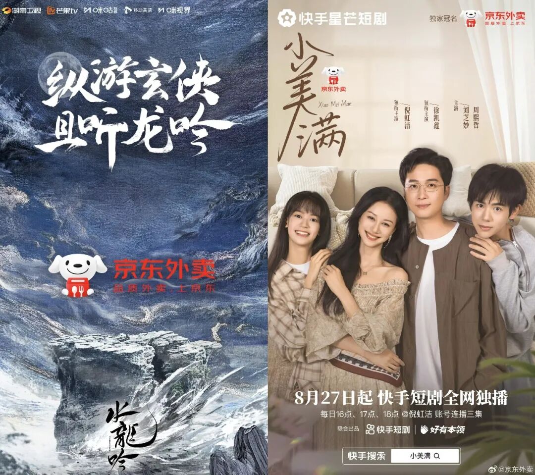 相比之下京東外賣(mài)的路徑稍有不同,除投放一部長(zhǎng)劇《水龍吟》之外,其資源還投向了2025年高熱的短劇,比如冠名快手星芒短劇《小美滿(mǎn)》等。不過(guò)不論是植入劇情還是每集末尾出現(xiàn)廣告語(yǔ),京東外賣(mài)在長(zhǎng)劇和短劇的營(yíng)銷(xiāo)方式和效果本質(zhì)上無(wú)太大差別。