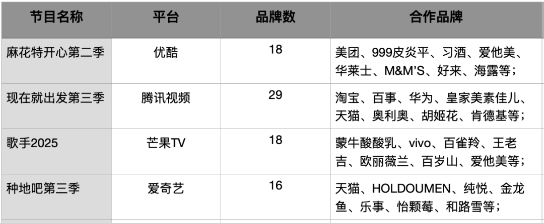 比如據(jù)軟廣通(擊壤旗下產(chǎn)品)統(tǒng)計(jì),優(yōu)酷的《麻花特開(kāi)心2》總植入品牌有18個(gè),愛(ài)奇藝的《一路繁花第二季》和《種地吧3》均達(dá)到16個(gè),騰訊視頻的《現(xiàn)在就出發(fā)第三季》匯聚了 29個(gè)品牌,芒果TV的《歌手2025》也斬獲18個(gè)品牌。這些綜藝有成熟且忠實(shí)的觀眾,已經(jīng)形成了很長(zhǎng)的情緒陪伴周期,對(duì)品牌而言這就意味著投放會(huì)有更確定可預(yù)期的回報(bào)。