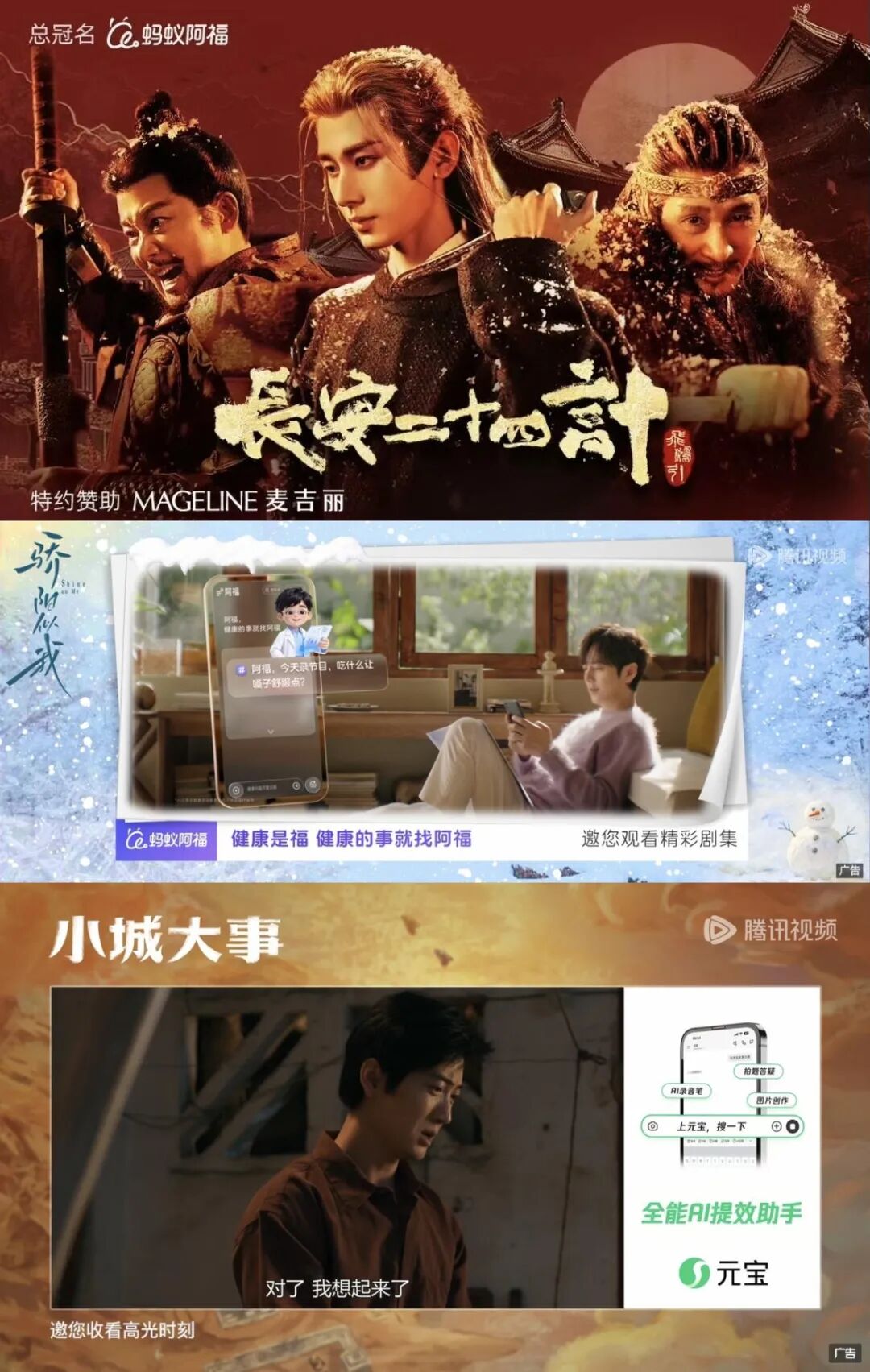 螞蟻阿福x《長(zhǎng)安二十四計(jì)》《驕陽(yáng)似我》,騰訊元寶x《小城大事》
