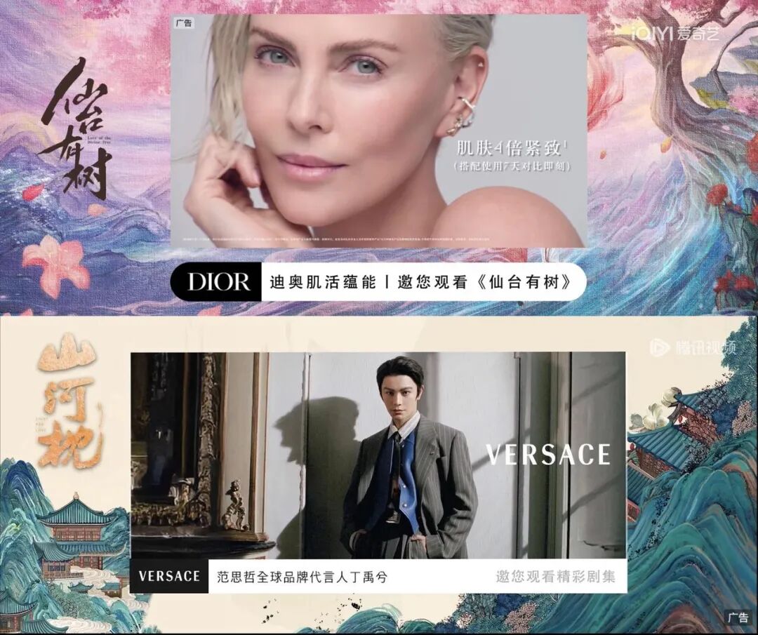 一種常見(jiàn)方式,是品牌直接投放自家代言人參與的劇綜。這種策略過(guò)去也存在,但今年的不同之處在于,一些此前很少出現(xiàn)在劇綜廣告中的奢侈品牌,也開(kāi)始采用這一方式。例如,迪奧在護(hù)膚系列代言人鄧為首次擔(dān)任男主的劇集《仙臺(tái)有樹(shù)》中進(jìn)行投放,范思哲則投放了全球品牌代言人丁禹兮主演的《山河枕》。