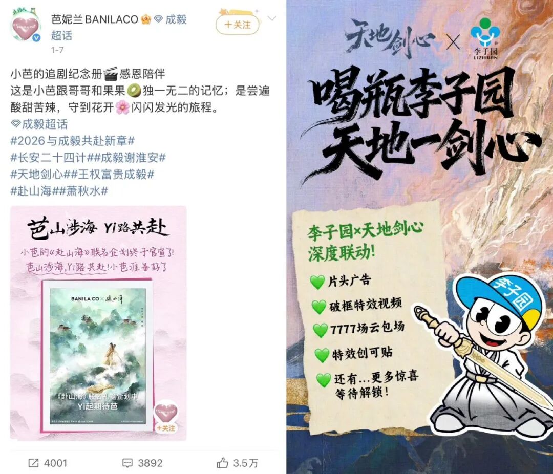 從劇綜內(nèi)容到具體的人,品牌投放重心的轉(zhuǎn)移,是對(duì)可被驗(yàn)證、可被轉(zhuǎn)化的確定性要素的重新排序。明星與綜藝人所承載的粉絲關(guān)系,正在成為劇綜營(yíng)銷(xiāo)中最清晰、也最直接的價(jià)值通道。
