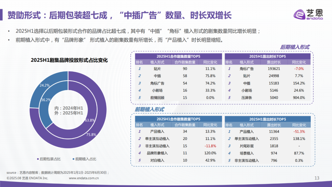 現(xiàn)在,軟植入就顯得不那么靈活了,其制作時(shí)間周期長(zhǎng),調(diào)整空間小,想要快速增減很難實(shí)現(xiàn)。所以相應(yīng)地,可后期包裝、可隨時(shí)增減的中插廣告和硬廣占比持續(xù)提升。據(jù)藝恩數(shù)據(jù)發(fā)布報(bào)告顯示,2025年上半年選擇后期包裝的品牌占超70%,中插廣告在數(shù)量和時(shí)長(zhǎng)上都有所增長(zhǎng)。