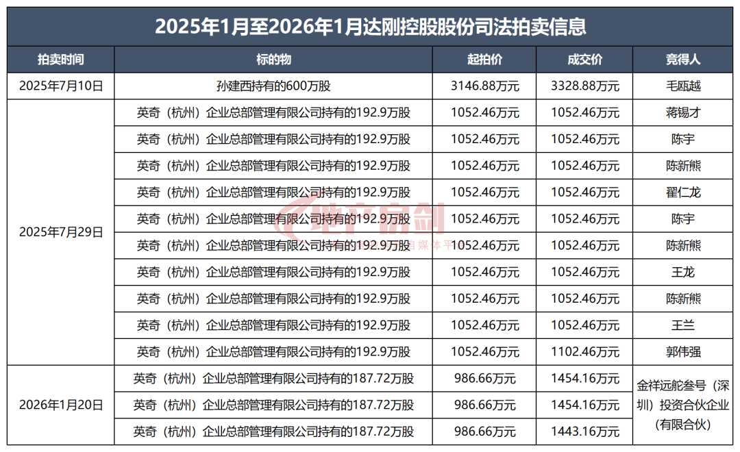 值得注意的是,在剛剛過去的2025年,除了達(dá)剛控股原實(shí)控人孫建西持有的達(dá)剛控股600萬股在2025年7月10日進(jìn)行司法拍賣之外,英奇(杭州)企業(yè)總部管理有限公司持有的達(dá)剛控股1929萬股拆分成10個(gè)標(biāo)的在2025年7月29日也進(jìn)行了司法拍賣。