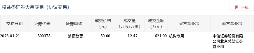 1月21日,鼎捷數(shù)智大宗交易成交12.42萬股,成交額621萬元,占當日總成交額的0.61%,成交價50元,較市場收盤價57.59元折價13.18%。