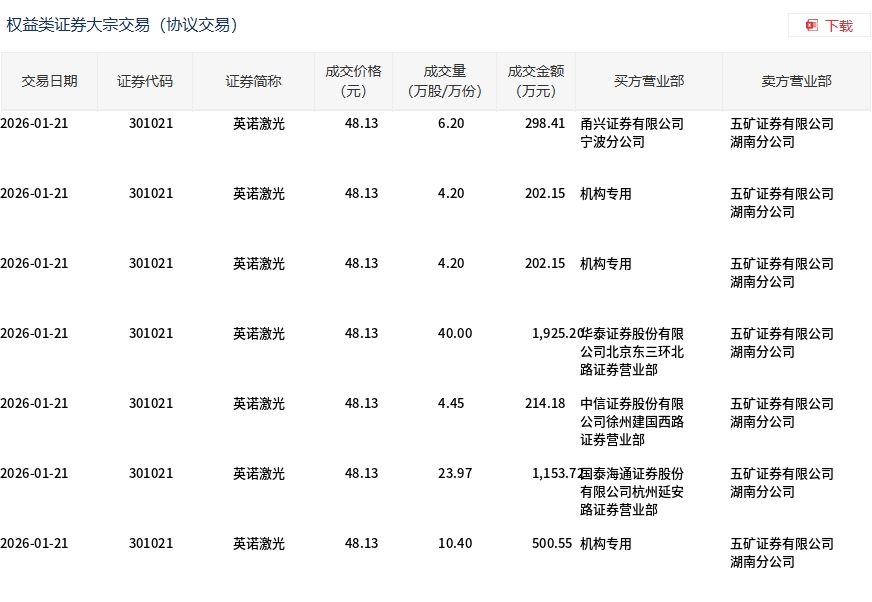 1月21日,英諾激光大宗交易成交93.42萬(wàn)股,成交額4496.36萬(wàn)元,占當(dāng)日總成交額的5.28%,成交價(jià)48.13元,較市場(chǎng)收盤價(jià)61.66元折價(jià)21.94%。
