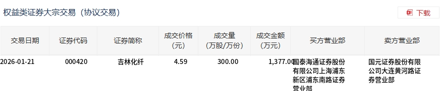 1月21日,吉林化纖大宗交易成交300萬股,成交額1377萬元,占當(dāng)日總成交額的2.45%,成交價4.59元,較市場收盤價4.68元折價1.92%。