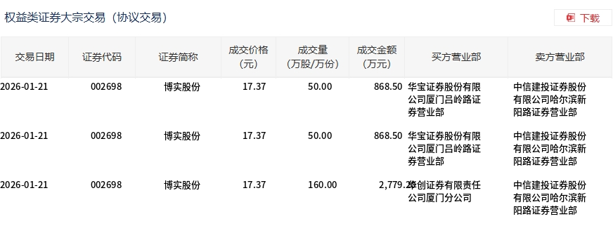 1月21日,博實股份大宗交易成交260萬股,成交額4516.2萬元,占當日總成交額的4.92%,成交價17.37元,較市場收盤價17.91元折價3.02%。