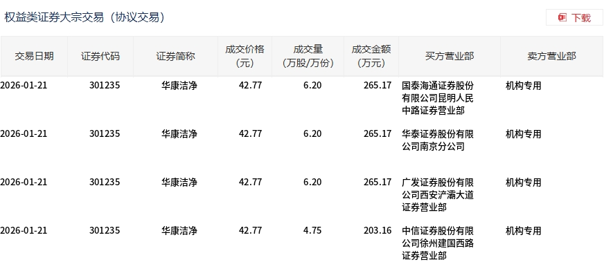1月21日,華康潔凈大宗交易成交23.35萬股,成交額998.67萬元,占當(dāng)日總成交額的1.29%,成交價(jià)42.77元,較市場收盤價(jià)49.05元折價(jià)12.8%。