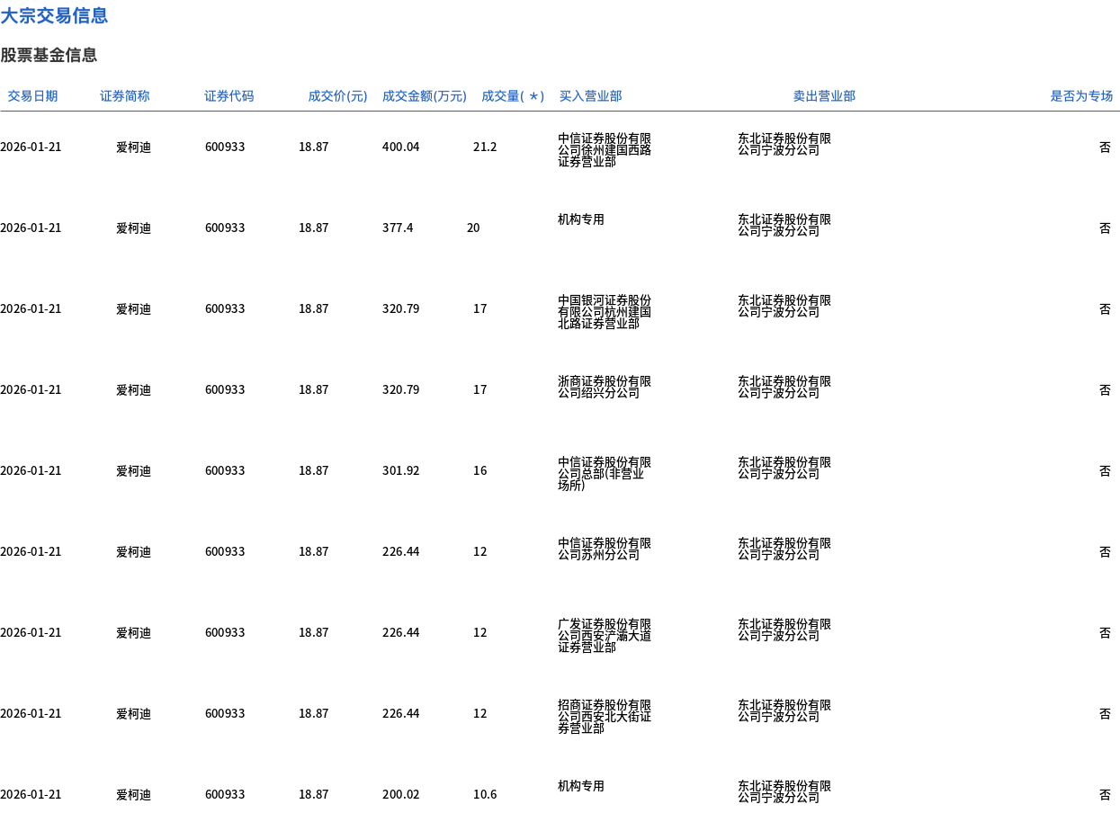 1月21日,愛柯迪大宗交易成交137.8萬股,成交額2600.28萬元,占當(dāng)日總成交額的8.47%,成交價(jià)18.87元,較市場(chǎng)收盤價(jià)20.28元折價(jià)6.95%。