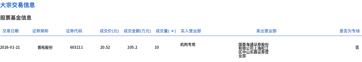 1月21日,晉拓股份大宗交易成交10萬股,成交額205.2萬元,占當(dāng)日總成交額的1.62%,成交價(jià)20.52元,較市場收盤價(jià)22.89元折價(jià)10.35%。