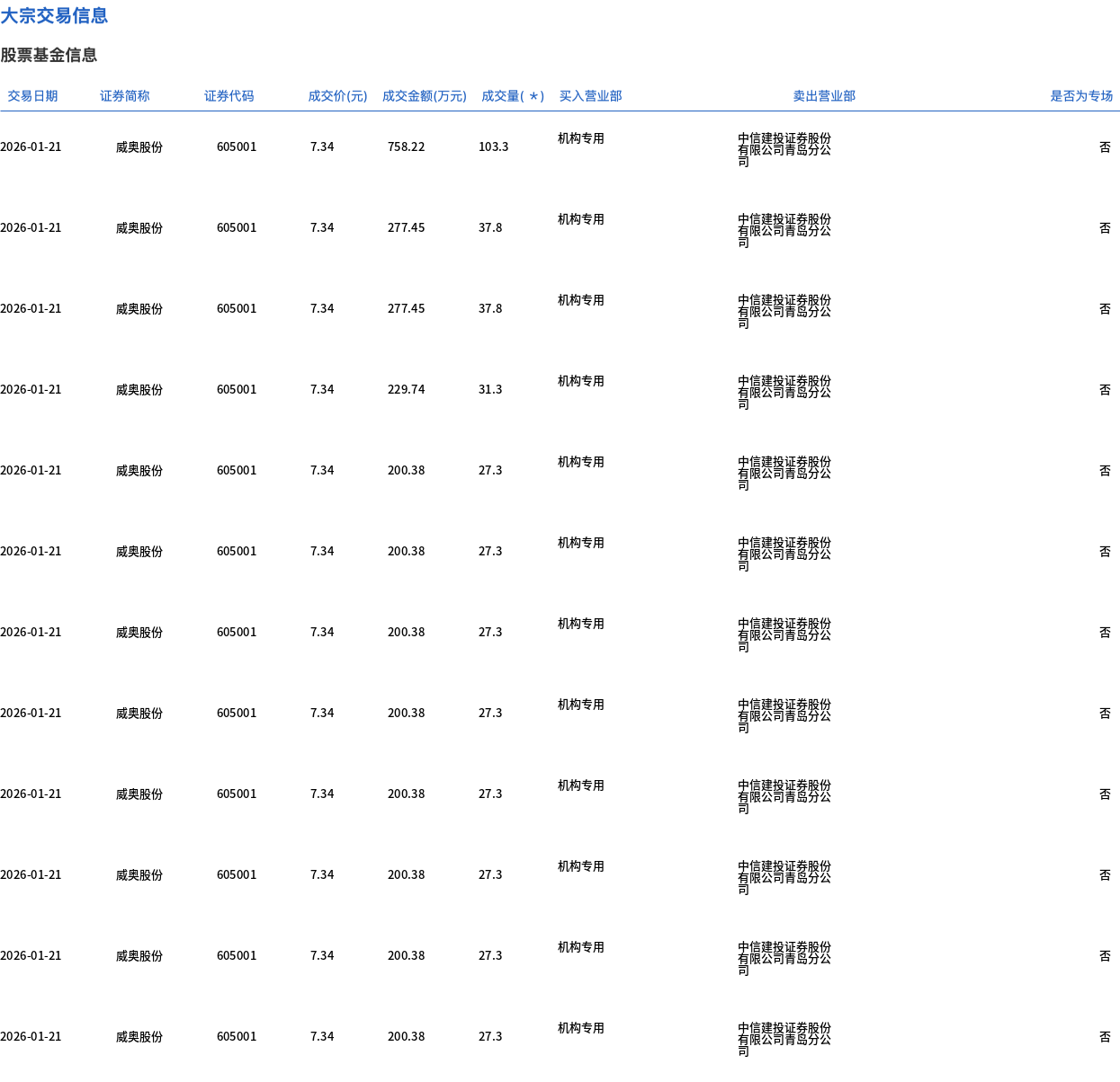 1月21日,威奧股份大宗交易成交428.6萬(wàn)股,成交額3145.9萬(wàn)元,占當(dāng)日總成交額的35.88%,成交價(jià)7.34元,較市場(chǎng)收盤(pán)價(jià)8.19元折價(jià)10.38%。