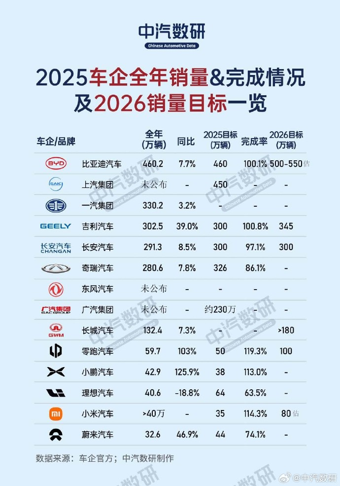 2025年的銷量榜單,是行業(yè)格局重塑最直觀的晴雨表。在中汽數(shù)研的一份2025年車企銷量排名中,比亞迪以460.2萬輛的絕對(duì)優(yōu)勢(shì)登頂,上汽、一汽分列二三位,而蔚來在該榜單中以32.6萬輛位居末位。