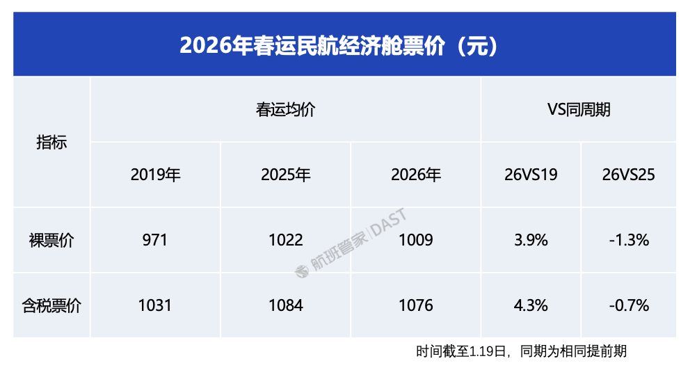 航班管家數(shù)據(jù)數(shù)據(jù)顯示,由旺盛出行需求牽動,2月2日至3月13日機票預訂價格逐步上漲,但尚未出現(xiàn)同比漲幅激增情況。截至1月19日,國內(nèi)航班經(jīng)濟艙平均含稅票價約為1076元,同比下降1.3%,較2019年同期上漲4.3%。