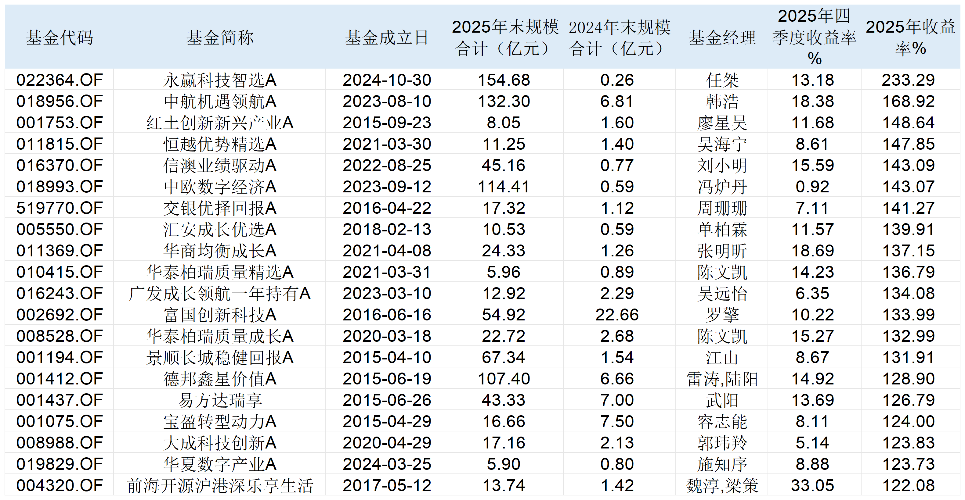 表:2025年收益率排名前20位的主動(dòng)權(quán)益基金明細(xì)  來源:Wind 界面新聞?wù)?/figcaption>