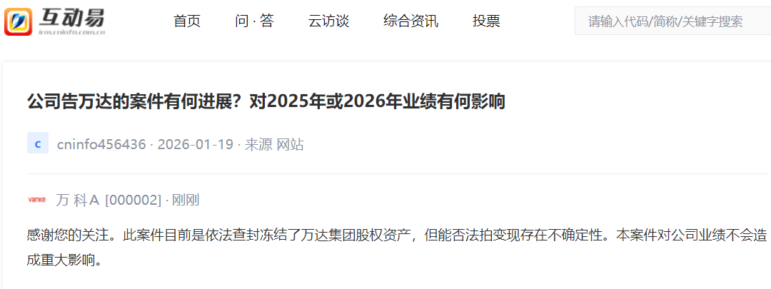 針對(duì)投資者關(guān)于“ 公司告萬達(dá)的案件有何進(jìn)展?對(duì)2025年或2026年業(yè)績(jī)有何影響?”的提問,萬科A1月22日在互動(dòng)平臺(tái)回應(yīng)稱,此案件目前是依法查封凍結(jié)了萬達(dá)集團(tuán)股權(quán)資產(chǎn),但能否法拍變現(xiàn)存在不確定性。本案件對(duì)公司業(yè)績(jī)不會(huì)造成重大影響。