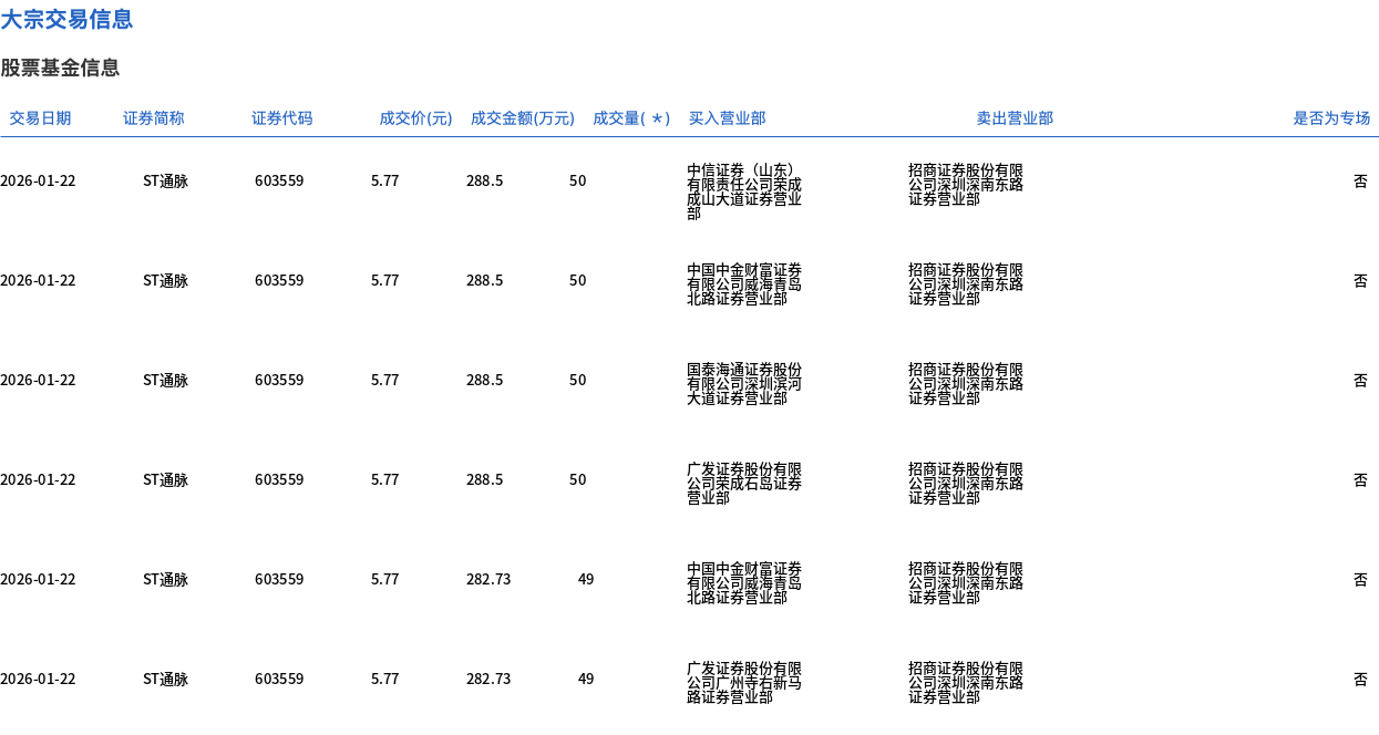 1月22日,ST通脈大宗交易成交298萬股,成交額1719.46萬元,占當(dāng)日總成交額的13.48%,成交價5.77元,較市場收盤價6.36元折價9.28%。